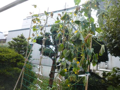 昨日の雨があがって、朝、庭を見るとキュウリが上のような状態になっていた。どうやら今年のキュウリは終わりを迎えたらしい。まだ食べられそうなキュウリを数本とって、手じまいすることにした。猛暑のせいか、7月の中旬から、べと病を発症し、罹患した葉…